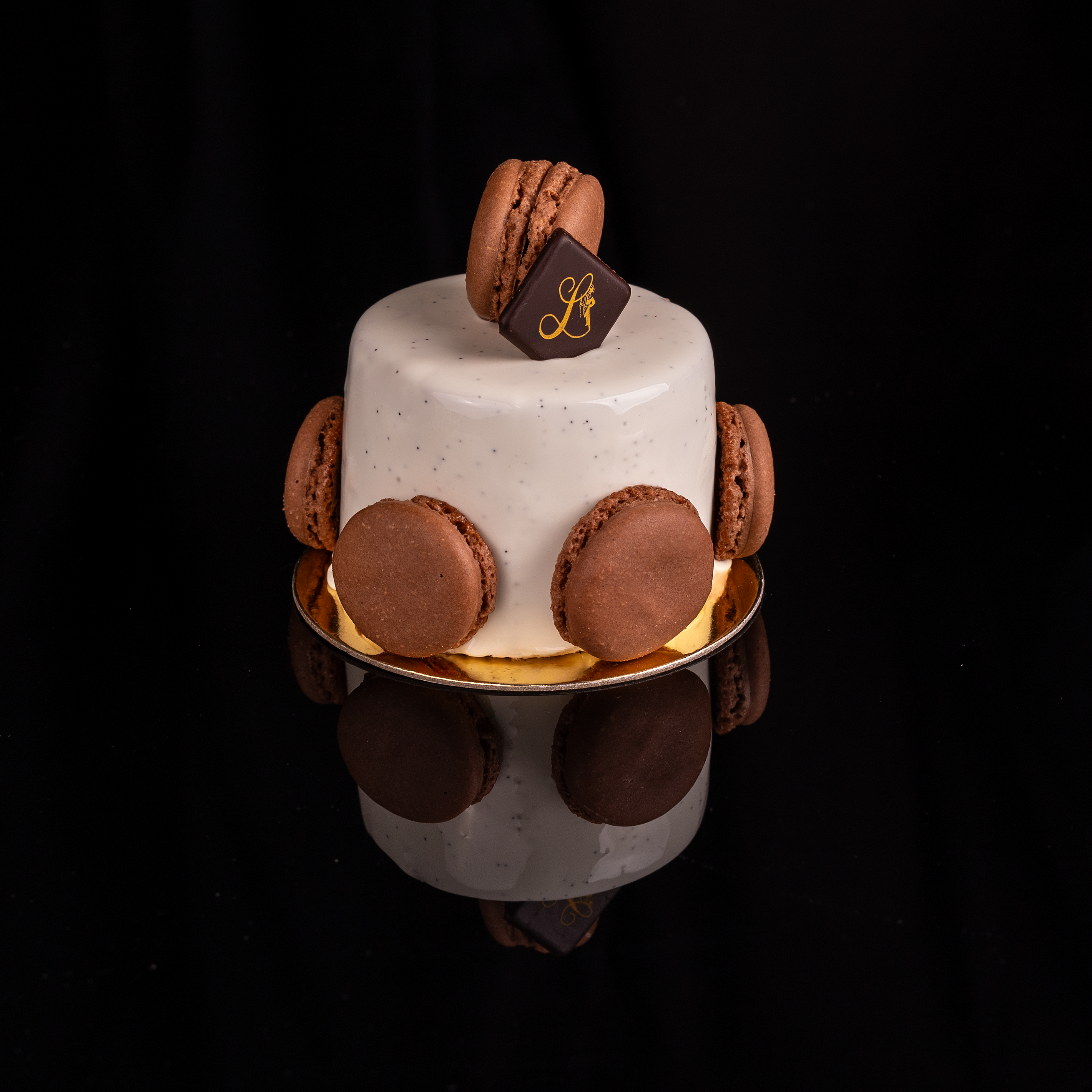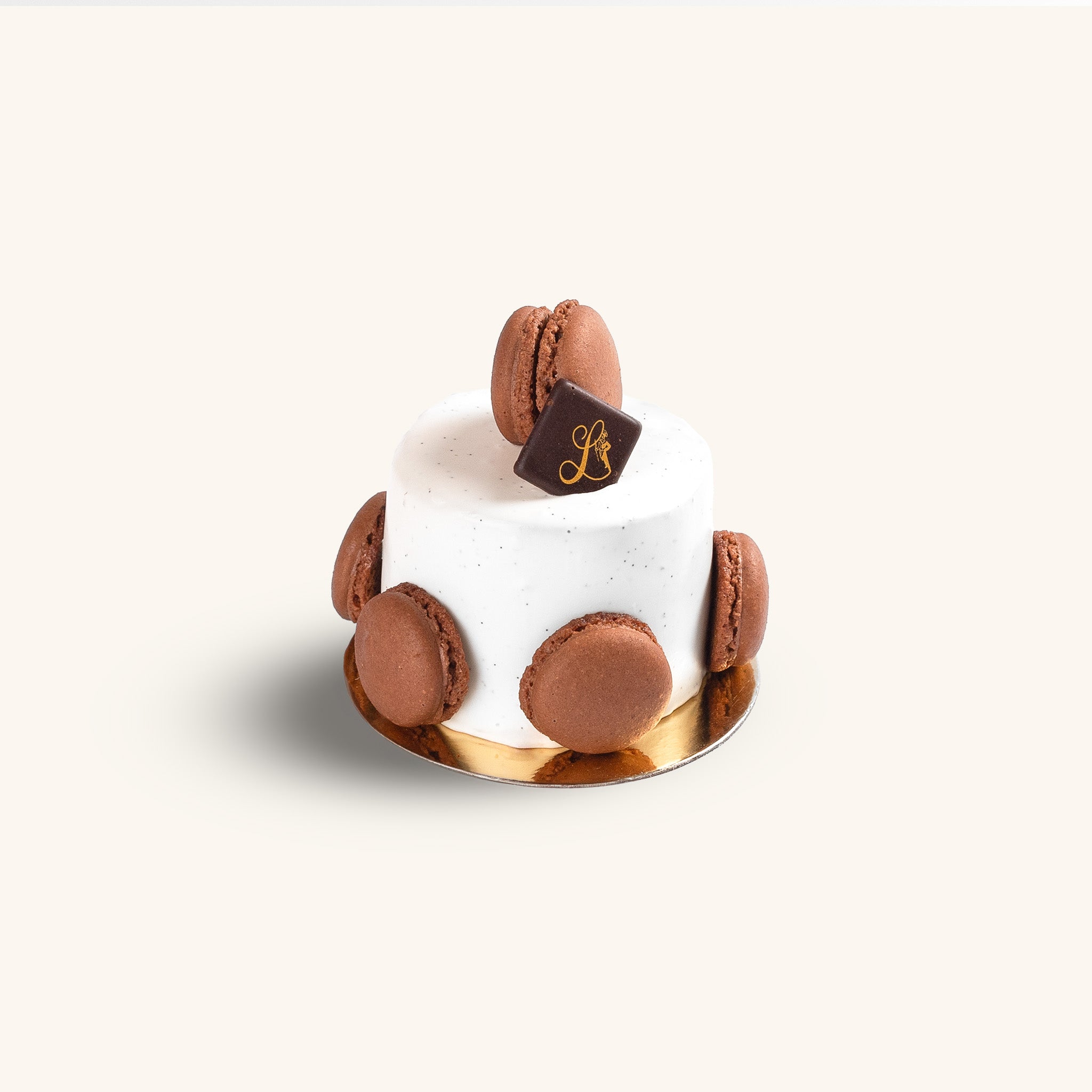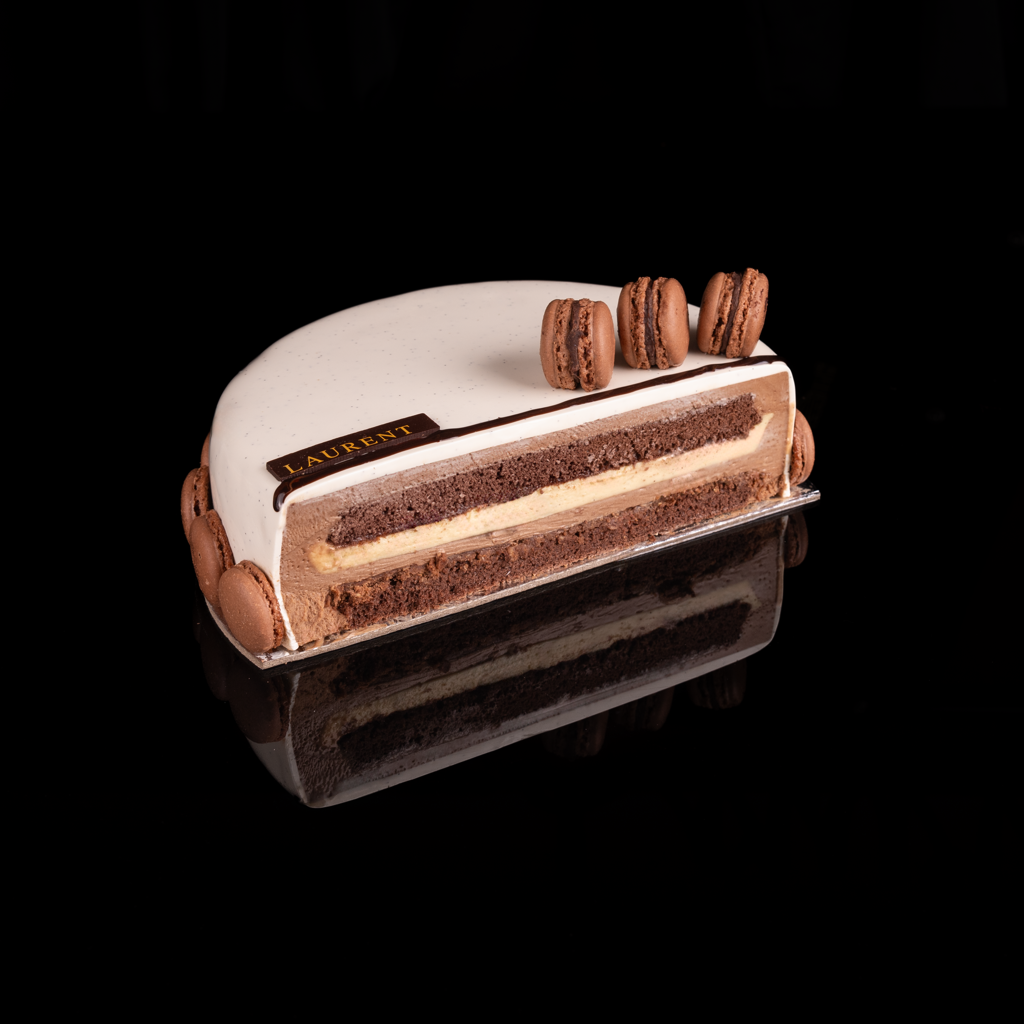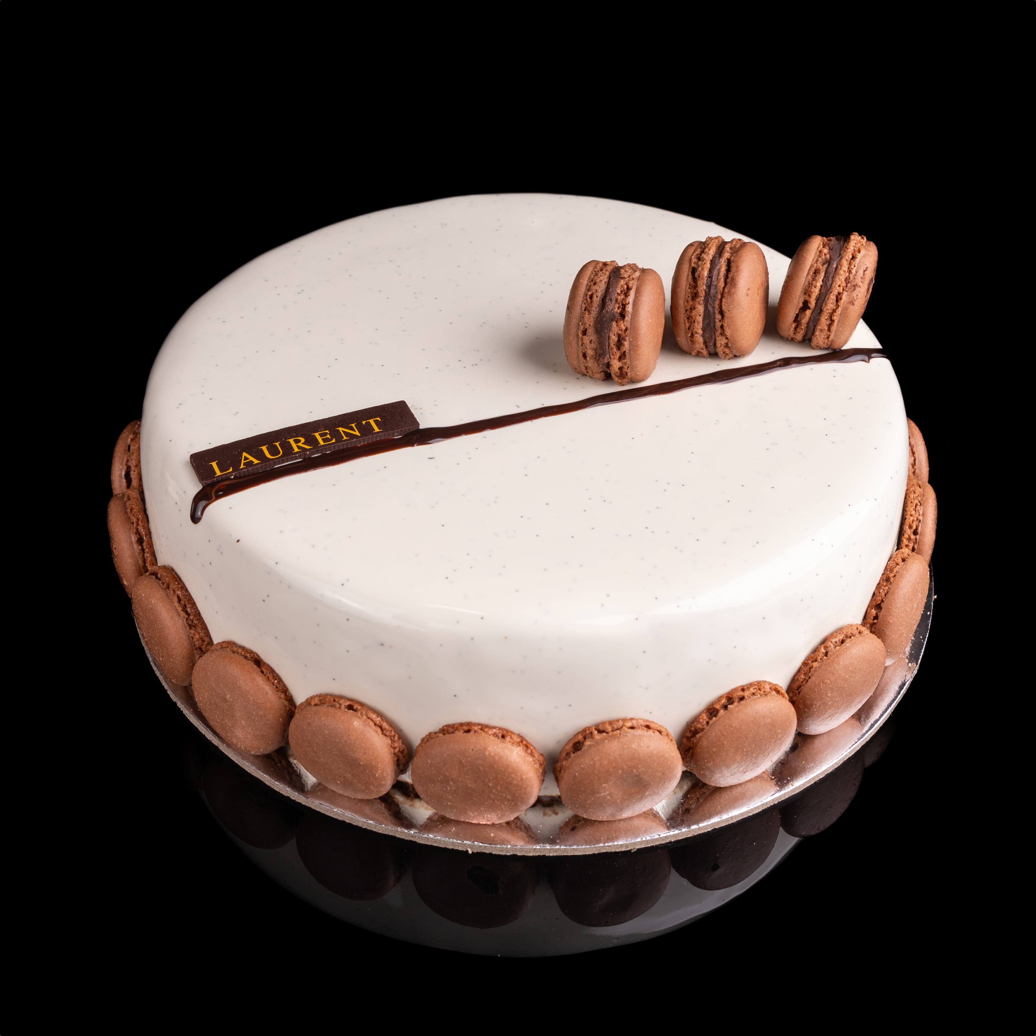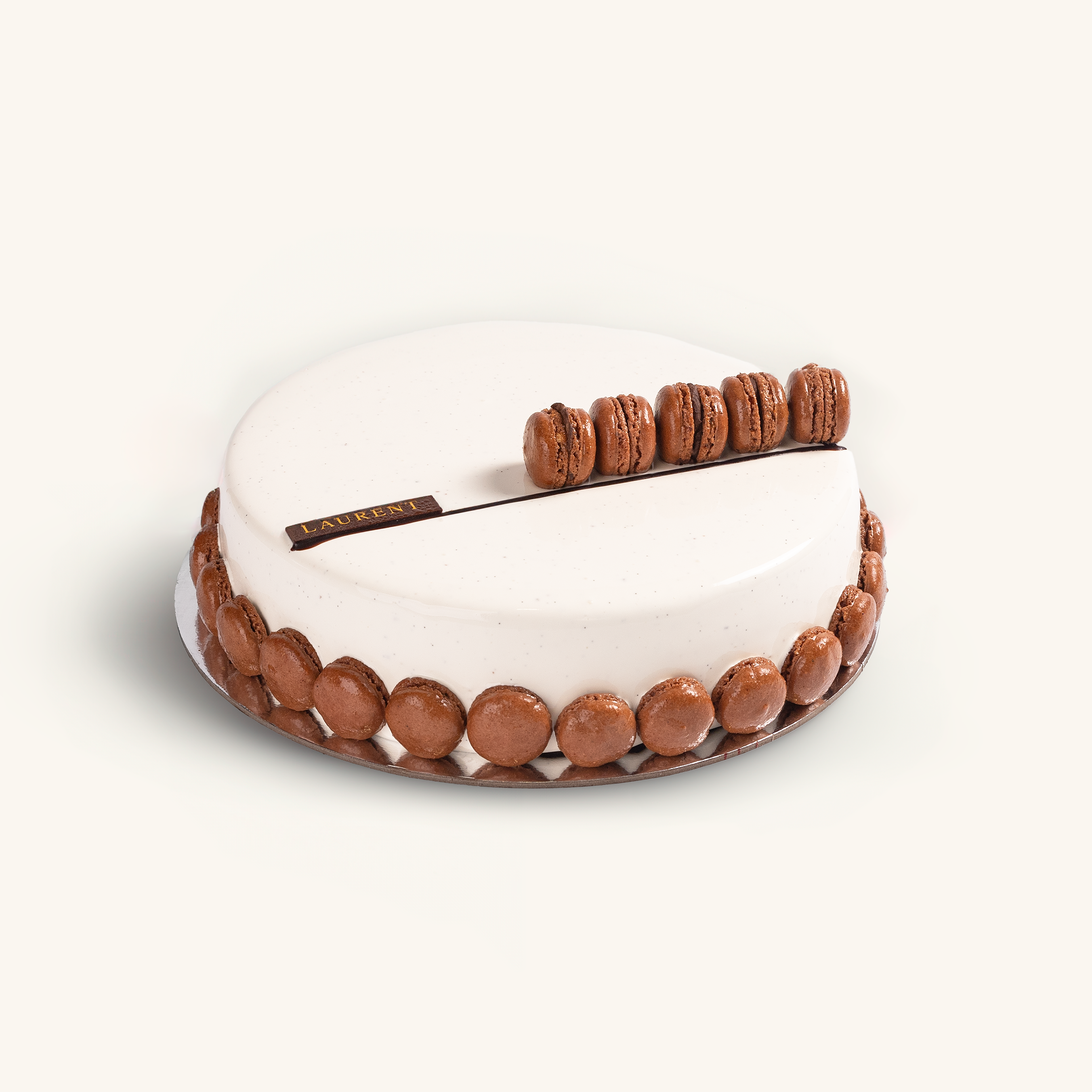 A delicious chocolate sponge base with a layer of baileys, crunchy hazelnut praline and mocha mousse topped with vanilla glaze and chocolate macaroons.