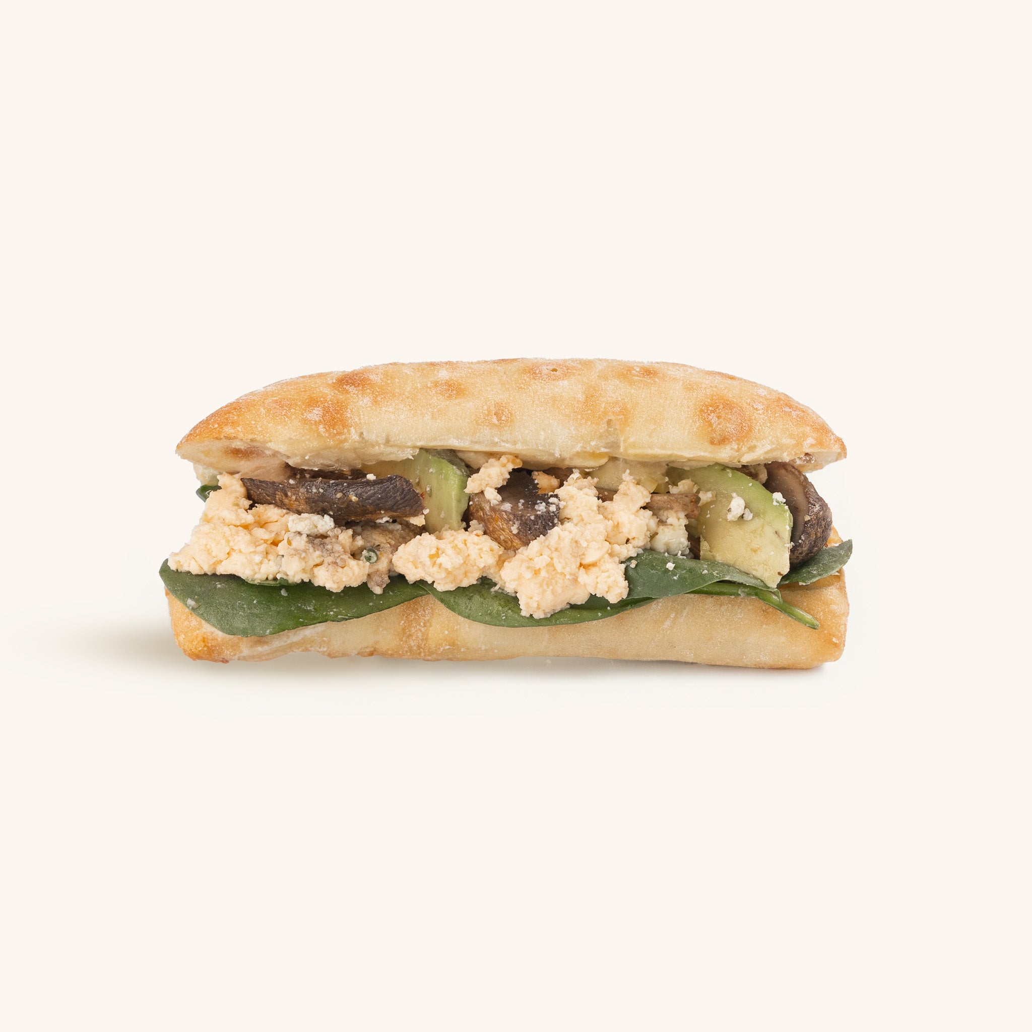 Scrambled egg, sliced mushrooms, feta, smashed avocado, spinach, chives