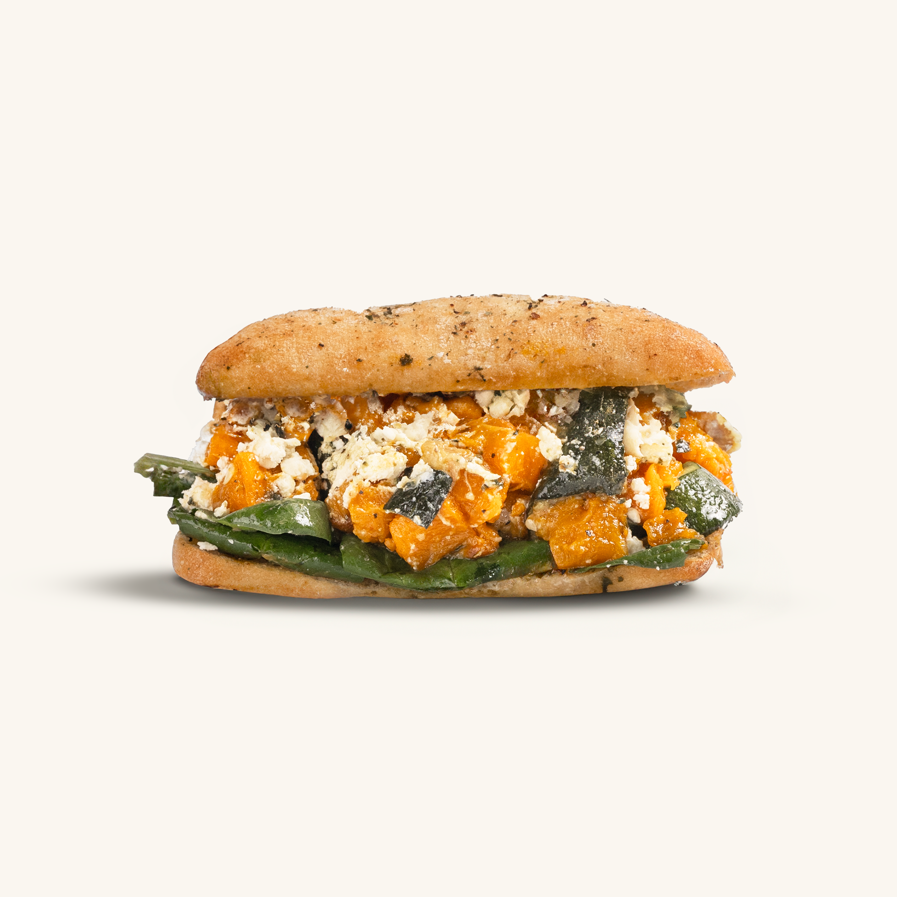 Roast veggies, feta, spinach, caramelised onions, pesto, pepper on herb ciabatta
