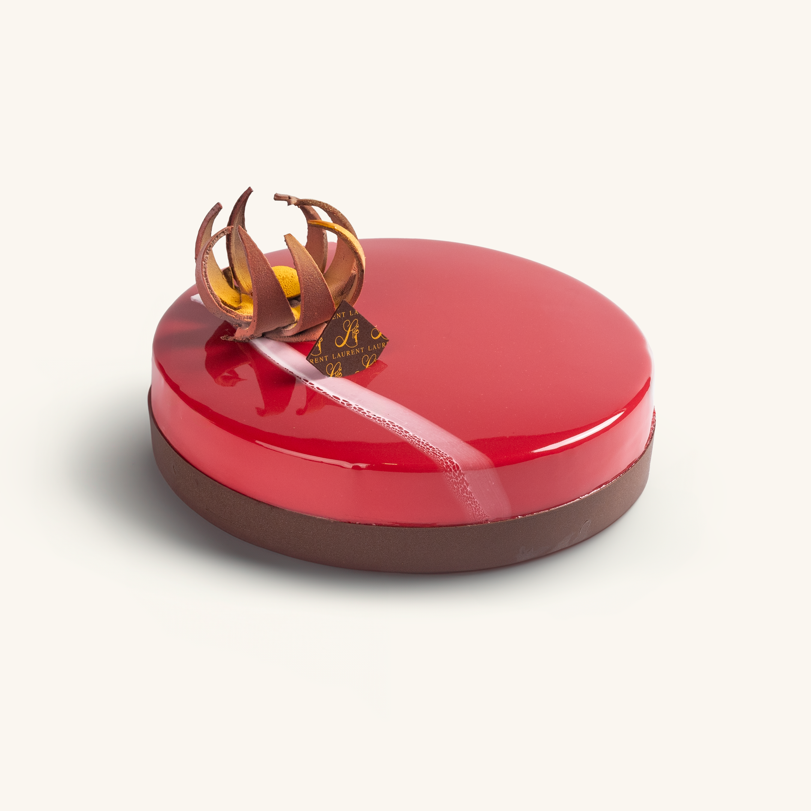 Almond Lime daqouise Sponge and raspberry curd encased in a 33% white chocolate mousse topped with raspberry glaze and a drizzle of white chocolate.